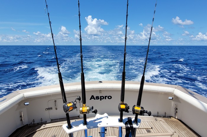 Suitable for a hardcore days’ sportfishing, or just a fun family day with complete beginners. Aspro’s sea keeping abilities are unmatched for its size. It is a quick and nimble boat on the fish and a very stable fishing platform, powered by twin 450hp Caterpillar engines she has a cruise speed of around 20 knots.